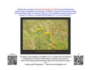 All proceeds from the sale of its prints and from the sale of individual prints (by special order only) are being donated to support Viewpoint Photographic Art Center. The fine-art-quality prints are offered matted and printed with archival materials. When ordered, they can be either mailed directly to you or delivered to you by arrangement at Viewpoint Photographic Art Center when ready. To order individual prints or for questions, please email me directly using the email on the back page of the calendar.